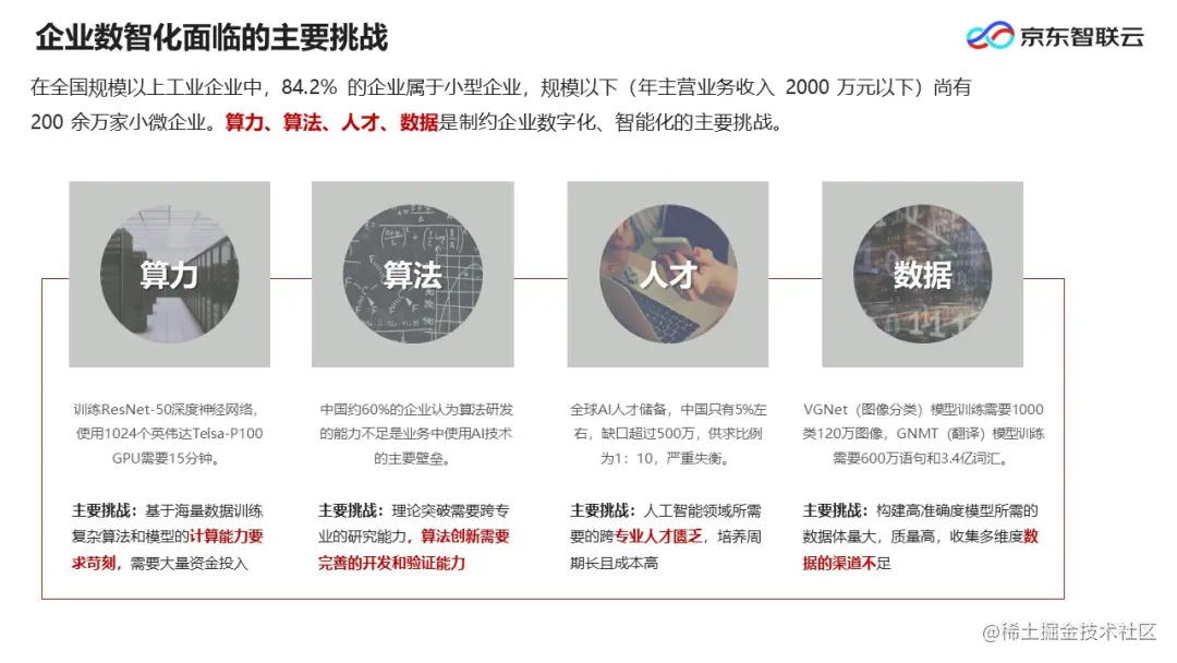 对于企业而言,特别是中小型企业很难把具体数字化技术运用起来,这其中主要涉及算力、算法、人才和数据四方面的问题。
