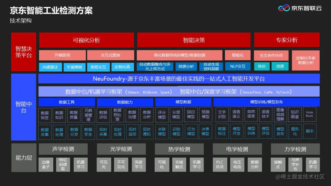 京东基于企业对工业检测的痛点,提出了具备可靠的自主学习能力的,包含物料、制成、产品及生产环境的智能化检测产品。其技术架构分为三层,能力层、智能中台及智慧决策平台。最低层是能力层,它涵盖了声、光、热、电、力等物理学检测和手段;核心层是智能中台,它提供了集数据中心和智能调度中心为合体的智能数据平台,可以完成大数据标准化、数据清洗、数据建模,同时还可以做模型训练、模型发布、模型调度等等一站式的人工智能开发平台平台。最上层是智慧决策平台,包含三大部分:第一个是可视化分析,它是经过京东经验积累设计制作的可视化 BI 工具例如开箱即用、交互式的图表;第二个是智能决策,它是基于智能数据平台跑出来的数据作为决策,结合生产过程当中实时的变化进行一些数据展示,决策数字生成以及相关联动系统的工作,比如自动下单和采购料等等;第三个是专家分析,它是面向于基础较弱的企业,由京东智联云数字专家提供的定制化的分析服务,帮助企业借助数据指导生产和经营。