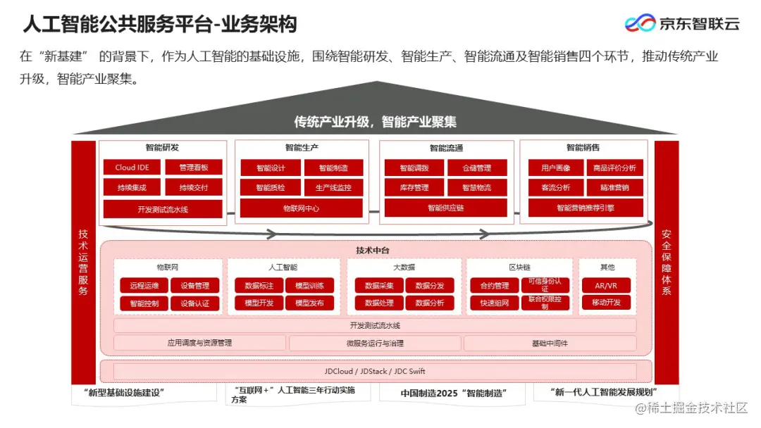 在“新基建” 的背景下,京东智联云构建了一个人工智能公共服务平台作为人工智能的基础设施,围绕智能研发、智能生产、智能流通及智能销售四个环节,推动传统产业升级,智能产业聚集。