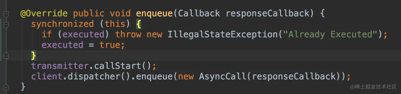 而enqueue(Callback responseCallback)方法,是在子线程中执行的,通过创建一个AsyncCall,传递给client.dispatcher(),这里面主要是线程的执行逻辑;