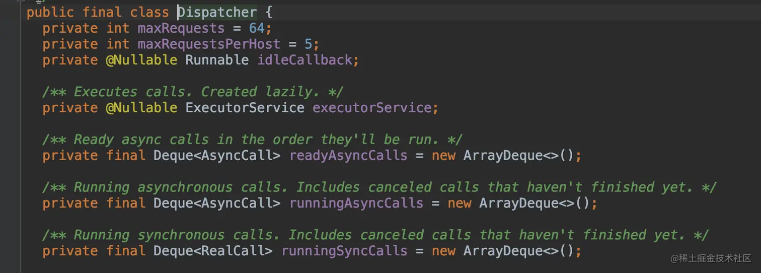 我们在看ReallCall源码的时候,频频见到这个方法,client.dispatcher().调用,这个方法的真面目就是Dispatcher,这个Dispatcher是在创建OkHttpClient的时候进行初始化的;