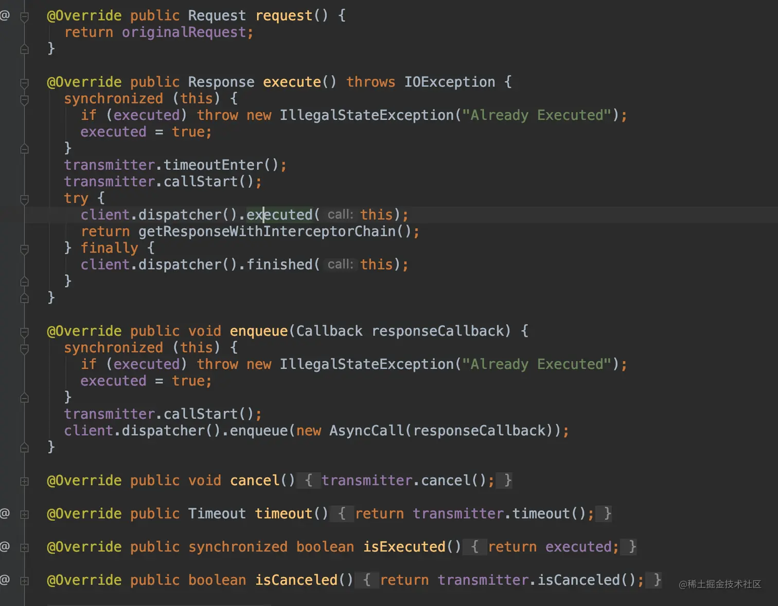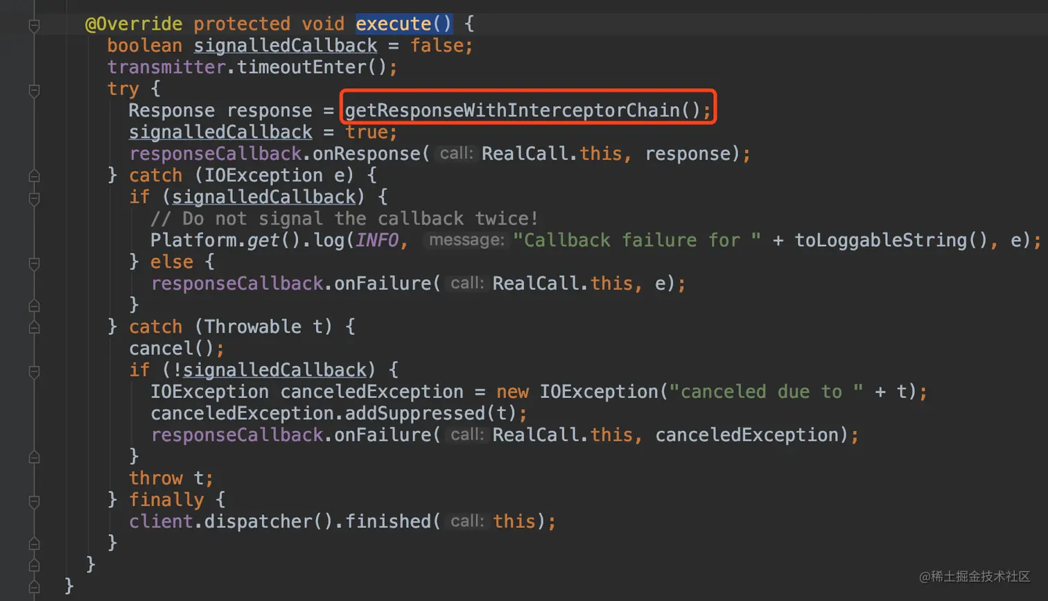 这几个方法是网络请求的最核心的方法,execute()方法实际上是同步请求,在当前线程就触发了网络请求,通过getResponseWithInterceptorChain()来执行网络请求从而获取到Response返回结果;