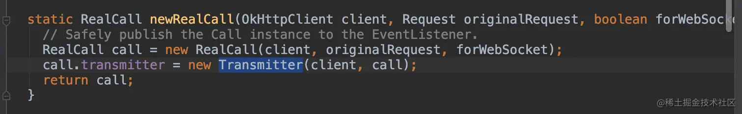 这个几个方法有没有熟悉的感觉,这里其实是通过桥接设计模式,实际调用的是OkHttpClient和Transmitter的函数;