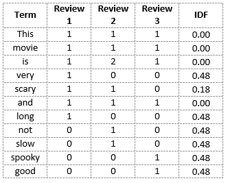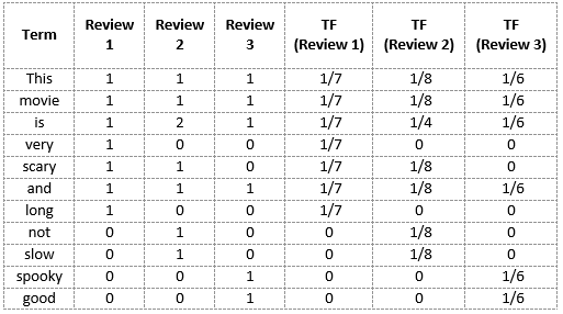 TF-IDF(‘this’, Review 2) = TF(‘this’, Review 2) * IDF(‘this’) = 1/8 * 0 = 0