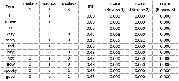- TF-IDF(‘scary’, Review 2) = 1/8 * 0.18 = 0.023