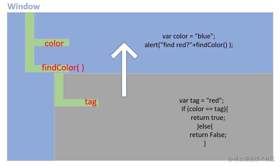 代码所在的执行环境能够访问该执行环境的变量对象。因此在全局中可以访问color变量以及findColor( )函数,findColor( )函数的局部执行环境中的代码可以访问 tag 变量。但是 findColor( )函数的局部执行环境中的代码访问了全局中的 color 变量是怎么理解呢,这时候就需要开头提出的作用域链了!
