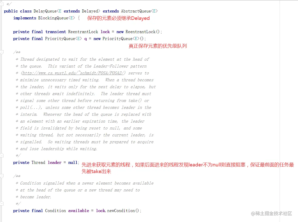 从上一步分析得出延迟队列必须拥有优先级队列的功能,同时保存的元素要有确定移除队列的时间,那么我们来看DelayQueue具体实现,基本属性源码如下图: