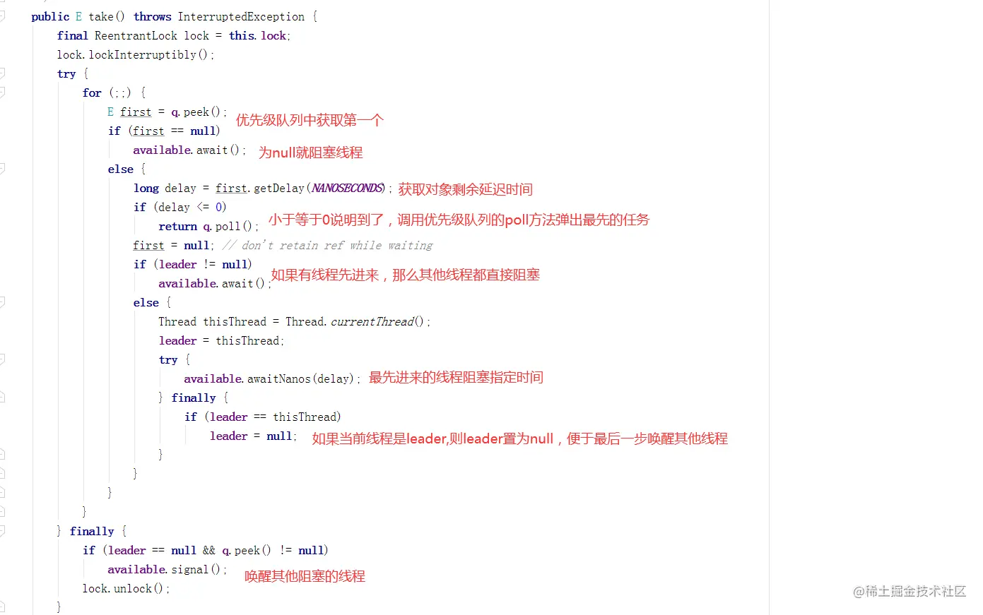 只要上一篇文章弄懂了优先级队列,在看延迟队列的代码就很简单了。首先利用的是优先级队列获取元素,然后调用getDelay(Delayed接口声明的)方法判断是否阻塞以及阻塞时间。