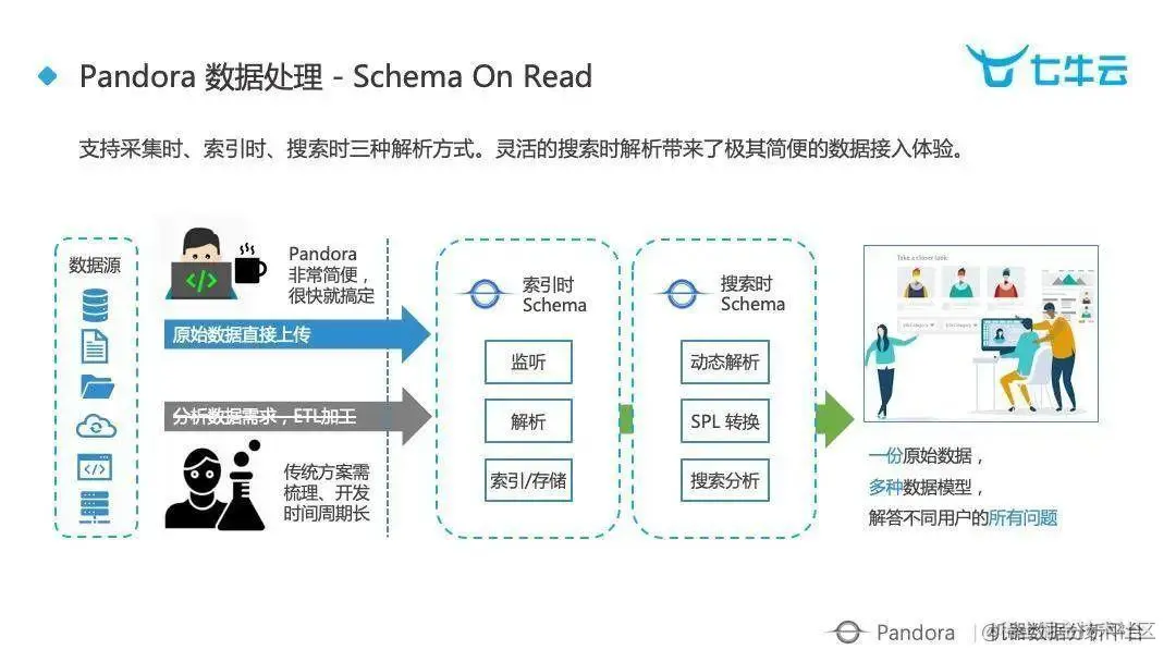 在数据取得之后,就是 Pandora 的重头戏——Schema On Read。我们可以从这张图上可以看到 Pandora 的不同之处。Pandora 可以在原始数据直接上传后,在分析时进行动态解析。也就说只需要一份原始数据,我们多种数据模型就能解答不同用户的所有问题。这样的优势在于你可以针对各种数据进行各种建模。针对变化的数据格式,只要在 Pandora 里做一些小小的变化便可完全兼容。这是纯粹的日志系统做不到的。