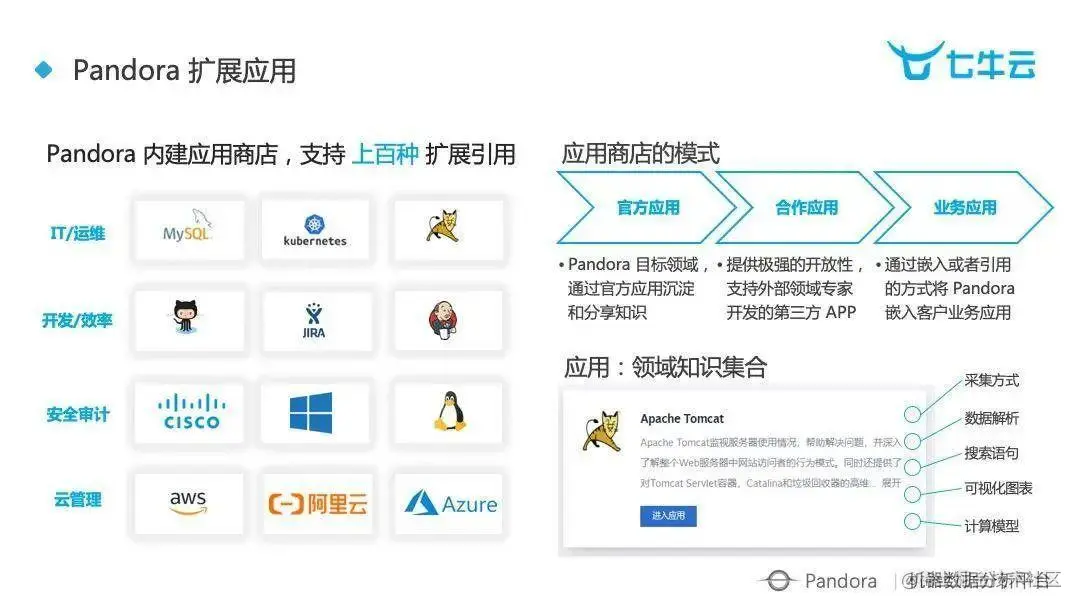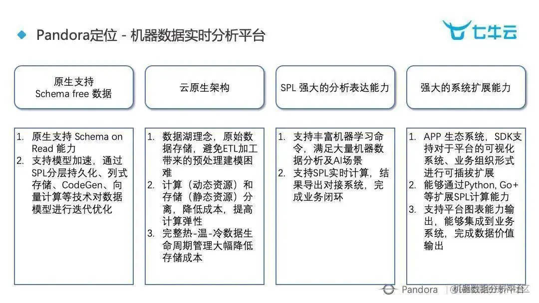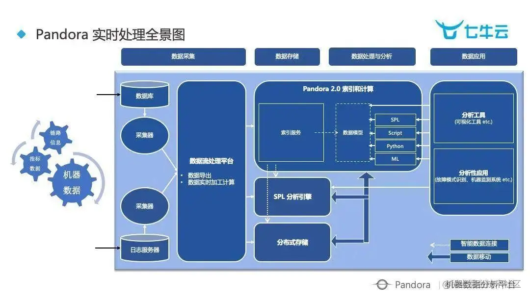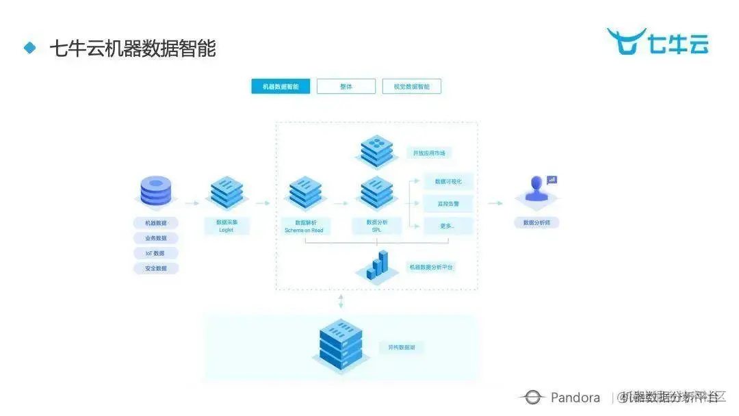 Pandora 在七牛云整个版图里,属于机器数据智能的这个模块。机器数据包含几个部分,像是 Iot 的数据、各种设备的数据都可以成为机器数据。