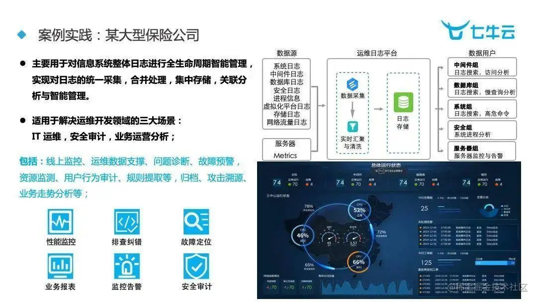 IT 运维,安全审计,业务运营分析;可提供包括线上监控、运维数据支撑、问题诊断、故障预警,资源监测、用户行为审计、规则提取、归档、攻击溯源、业务走势分析等服务。