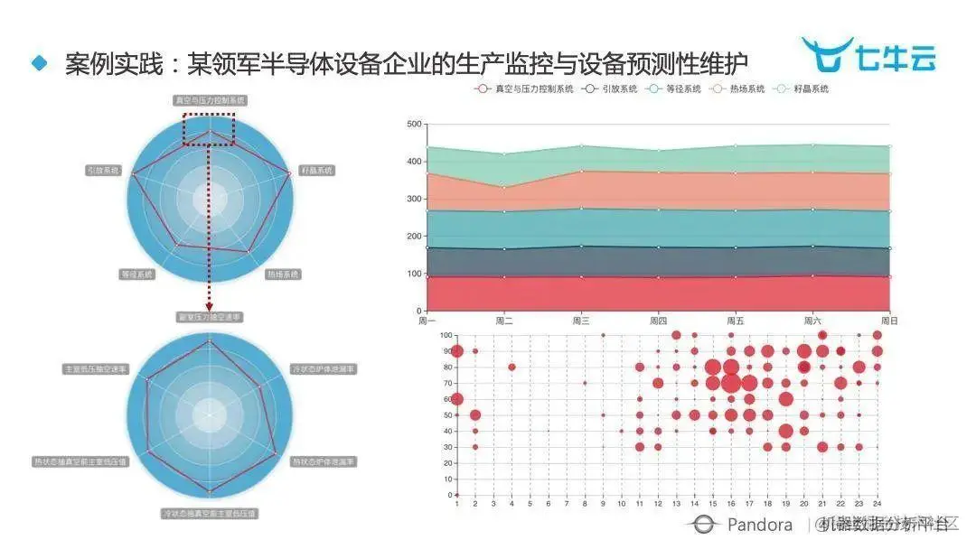 下面是半导体的企业案例,半导体的产业链非常长,在源头是一个叫做单晶炉的设备,用来提炼单晶硅。Pandora 可以帮助单晶硅做健康度的检查,也就说我们可以及时发现单晶炉的故障,在故障发生时及时报警,避免原材料无谓的投入,及时止损。从图中我们可以看出,Pandora 通过多个维度做分析,通过单晶炉里面的传感器收集数据,对设备进行生产监控和预测性维护。