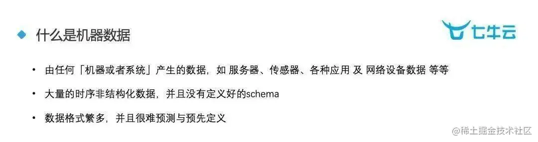 我们对它有个简单的定义:机器数据是任何机器或者系统所产生的数据。比如说服务器产生的数据、传感器产生的数据、还有各种应用产生的数据,包括网络设备等等。机器数据的一个特点,它是由大量的时序的非结构化的数据组成的。对于我们处理定义的机器数据来讲,没有预先定义好的 schema,并且它的数据格式特别多,而且很难预测和定义,也就是说很难说预知是什么样的格式进来,或者说我预先定义好它的格式。