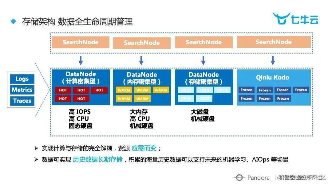 第二个特点是云原生的架构,Pandora 的整个体系可以避免 ETL 加工带来的预处理建模困难,同时计算(动态资源)和存储(静态资源)分离,降低成本,提高计算弹性,另外完整的热-温-冷数据生命周期管理,可以大幅降低存储成本。