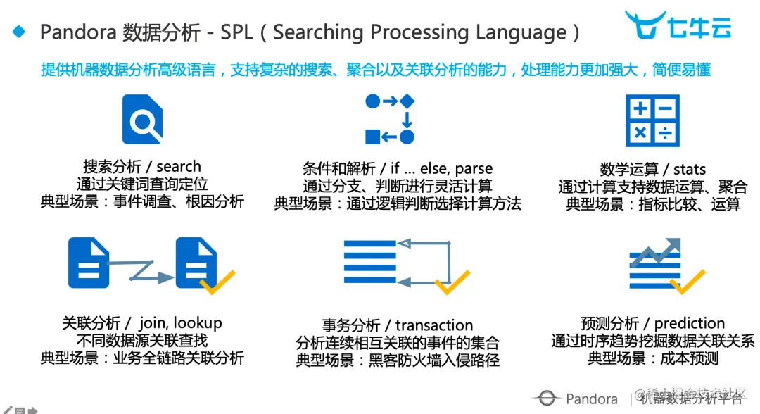 第三,是我们比较有特色的一个点:SPL 强大的分析表达能力。支持丰富机器学习命令,满足大量机器数据分析及 AI 场景;同时支持 SPL 实时计算,结果导出对接系统,完成业务闭环