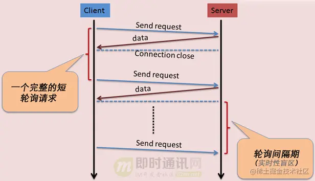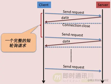 于是,一种被称为“短轮询”的数据获取模式出现了。在“短轮询”模式下,IM客户端定时轮询服务端,以便让用户知道是否有新的聊天消息存在。