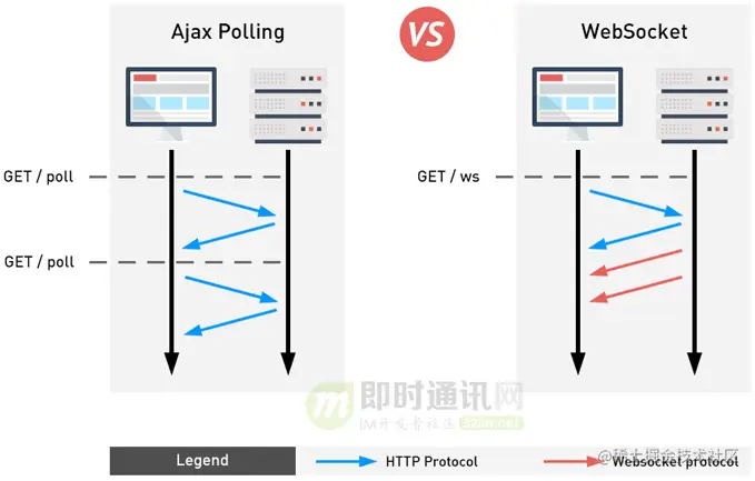 区别于强大的原生应用,Web端的IM系统,在很长一段时间内想实现真正的“实时性”,是非常困难的,因为无法直接使用UDP、TCP通信协议,在HTML5中的WebSocket出现之前,Web端几乎没有真正意义上的“双向实时通信”这种技术存在。