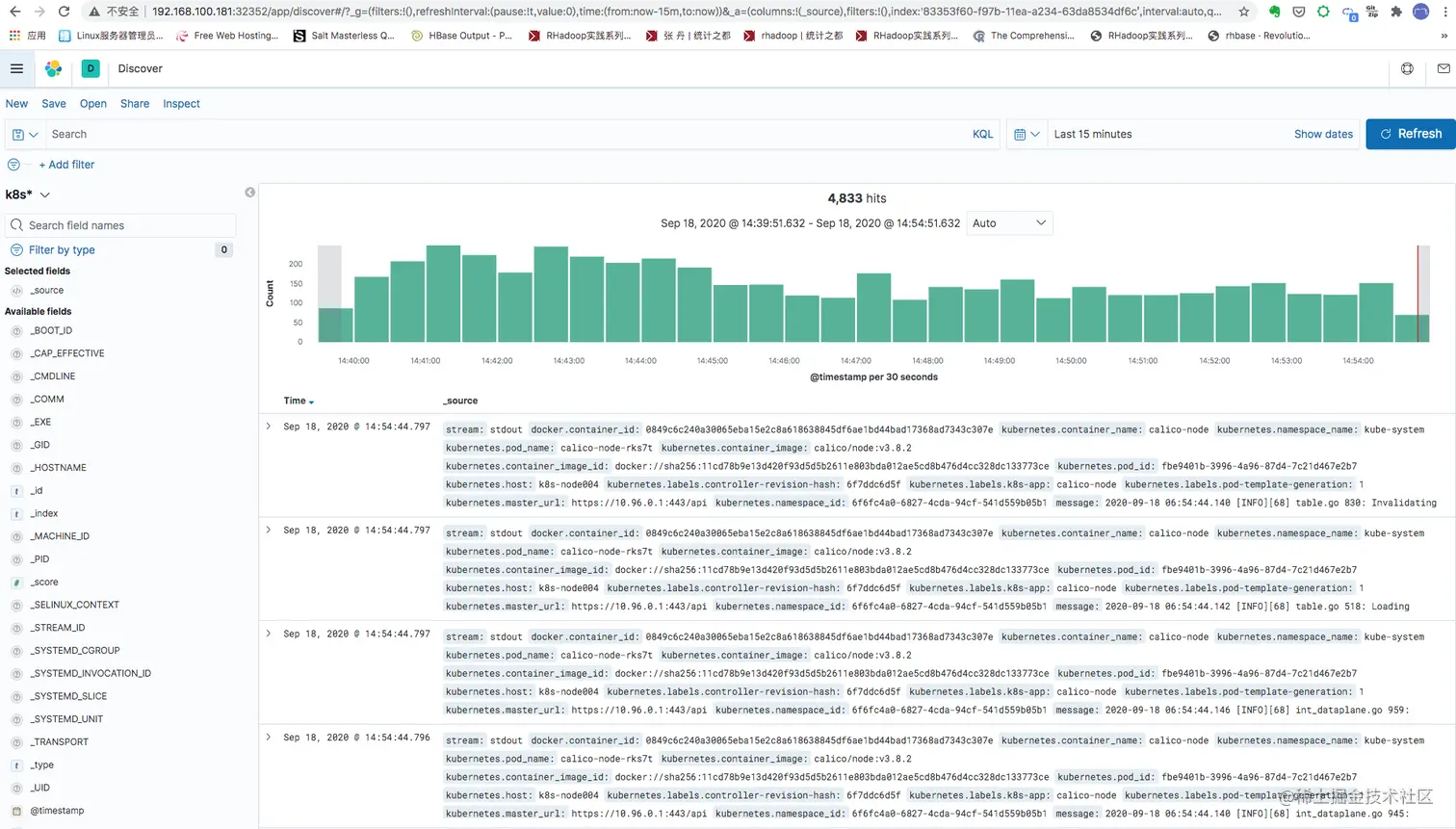 从输出信息可以看到,整套日志收集系统已经全部正常运行,现在就可以使用kibana查看收集到的日志了