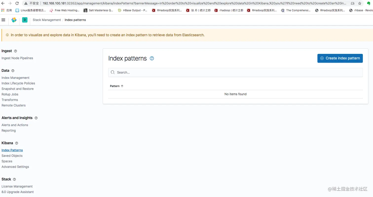 服务以及通过NodePort暴露,通过IP+32352,可以访问到kibana web界面,如图所示