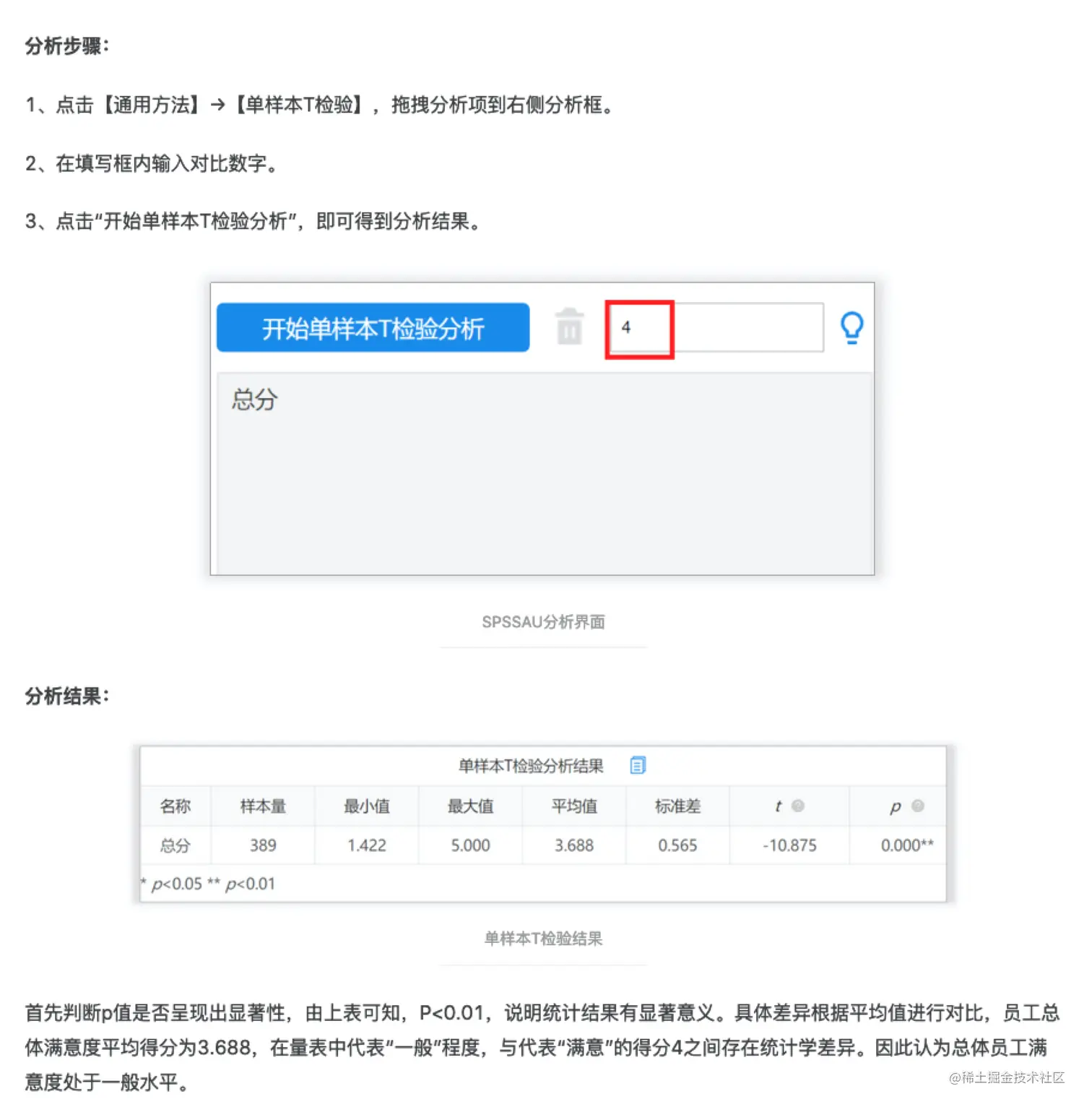 比如,某公司用五级李克量表的调查问卷进行员工满意度调查,其中‘4分’代表满意,分析人员可通过单样本t检验了解员工总体满意程度与“满意”(4)之间是否有明显差异。
