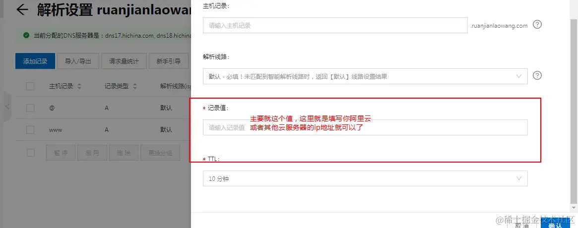 (4)这里主要就填写记录值这一项就可以,这里就是配置你的服务器ip,这样服务器就和你的域名关联起来了。
