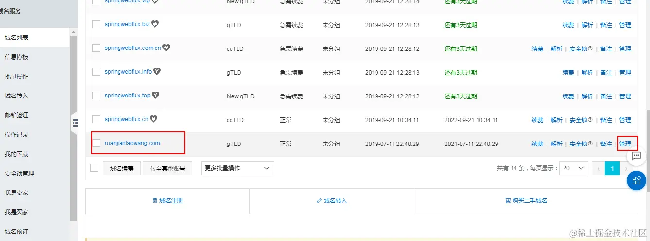 (2)选择对应的待操作域名,点击最后面的管理按钮