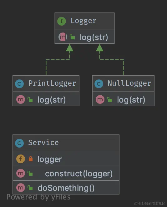 * 测试 PrintLogger 对象,联系上文可以知道在日记中写入了 DesignPatterns\Behavioral\NullObject\Service::doSomething 。