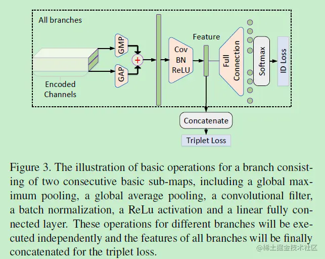 feature经过两个并行的global average pooling和global max pooling,堆叠后经过一个Conv+bn+relu,得到的feature一路经过FC layer + softmax求id loss。一路导出,和其他branch的output堆叠成一个feature,求triplet loss。