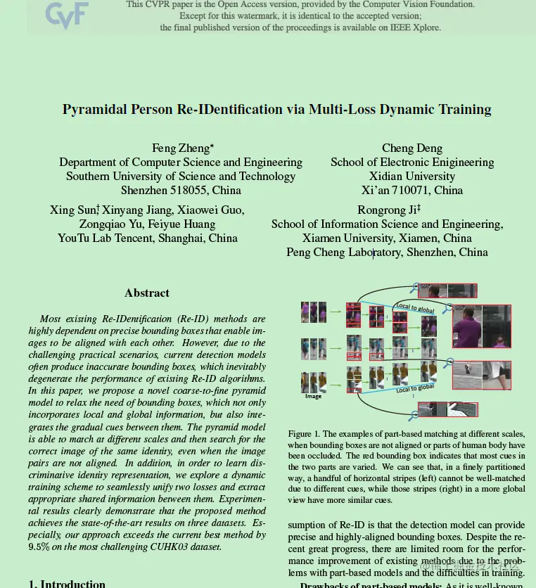 [1] Zheng F, Deng C, Sun X, et al. Pyramidal Person Re-IDentification via Multi-Loss Dynamic Training[C]. computer vision and pattern recognition, 2019: 8514-8522.