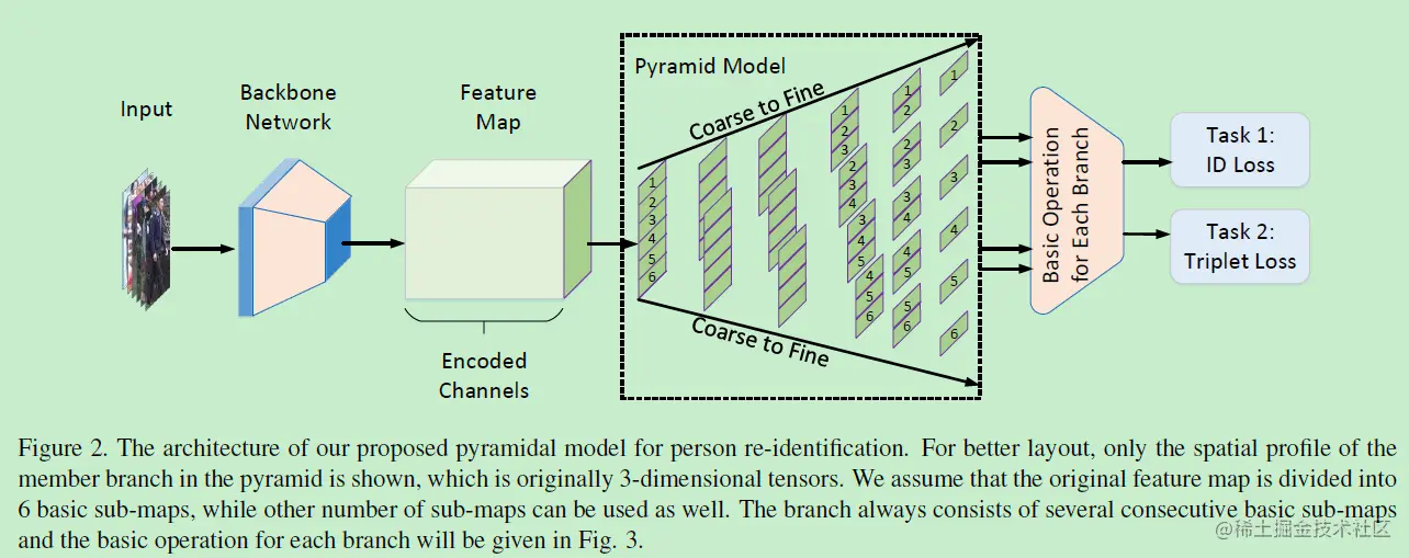 “To address above problems, in this paper, we specifically propose a novel coarse-to-fine pyramidal model based on the feature map extracted by a backbone network for person re-identification. First, the pyramid is actually a set of 3-dimensional sub-maps with a specific coarse-to-fine architecture, in which each member captures the discriminative information of different spatial scales. Then, a convolutional layer is used to reduce the dimension of features for each separated branch in the pyramid. Third, for each branch, the identification loss of a softmax function is independently applied to a fully connected layer which considers the features as the input. Furthermore...”