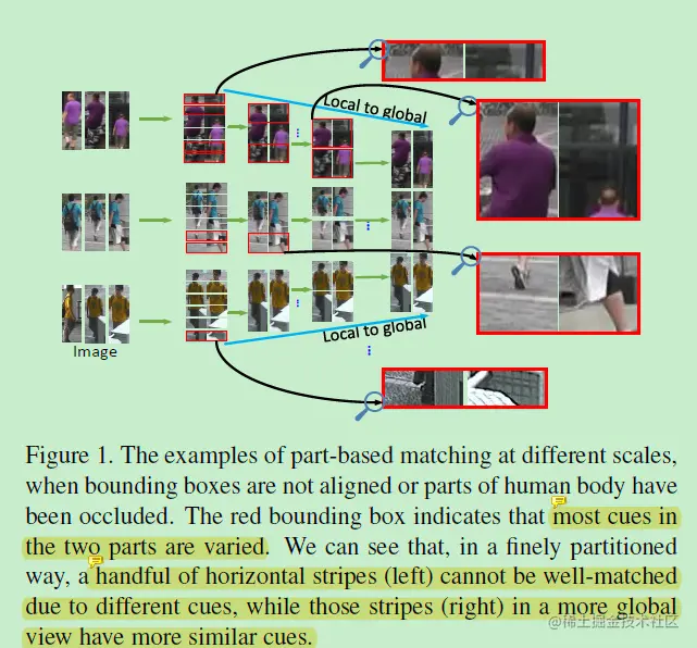 2、由于基于局部的模型存在问题并且训练困难,因此现有方法的性能改进空间有限。其主要存在但不仅限于两个缺陷:1)其模型表现依赖于一个强大鲁棒的行人检测模型输出一个精准的bounding box(否则无法对齐),然而恰恰现实情况下我们很难获得精准对其的bounding box。2)在此类模型中,全局信息被完全忽略,而全局功能通常对于微妙的视图更改和内部变化具有鲁棒性,如下图1可以看出,被切分的局部对图像的匹配也同样重要。