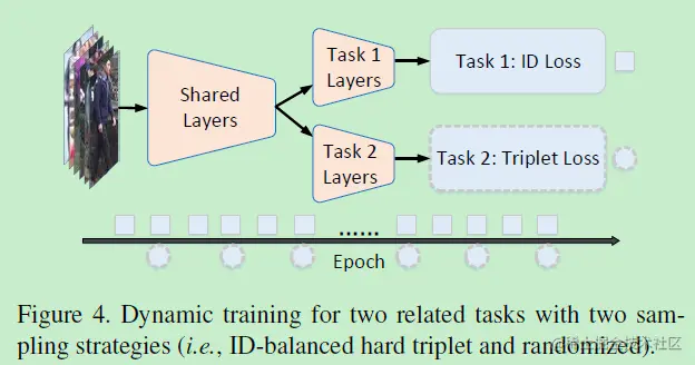 3、基于多loss/多任务的训练尽管有时候确实能够帮助提高ReID表现,但也仍存在一些困难:1)其表现高度依赖多个loss之间选择好一个合适的比重,而这个比重往往是人手动调节的。2)随着模型的逐步更新,不同任务的难度实际上会发生变化,从而导致针对不同迭代的适用权重会发生了变化。3)由于一些特殊考虑,采样策略在不同的loss下常常呈现多样性。