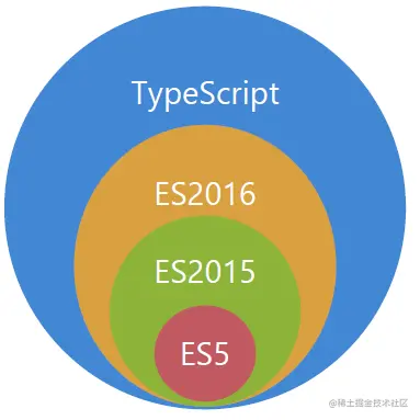 TypeScript 是 JavaScript 的超集。通俗点来讲就是在 JavaScript 的类型的基础上又拓展了很多新的类型(可选的静态类型和基于类的面向对象编程)且100%兼容 JavaScript。下图可以直观的表示它们的关系: