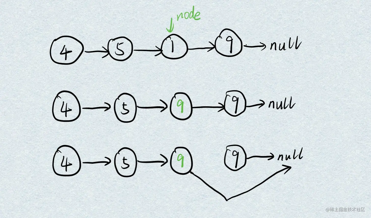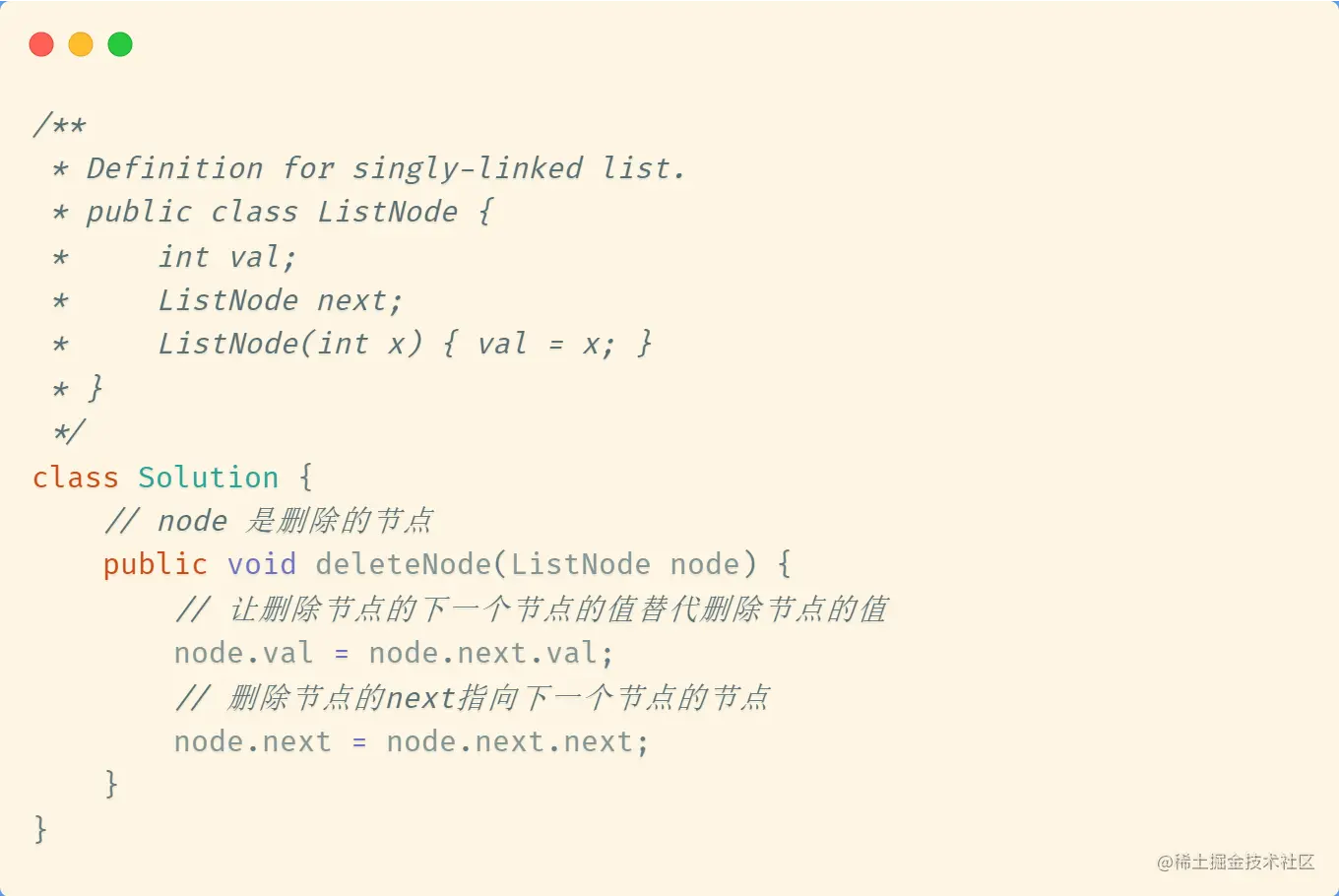 删除链表节点的正常思路是拿到删除节点的前一个节点 prev,让 prev.next 指向删除节点的 next 节点。这至少需要两个参数:链表的头节点 head 和删除节点 node。本题模板只给了删除的节点 node,提示信息已经说明了链表至少包含两个节点(节点值唯一),并且删除的节点不是末尾节点。怎么做呢?首先用删除节点的下一个节点的值覆盖删除节点的值,然后让删除节点的 next 指向其下一个节点的 next。
