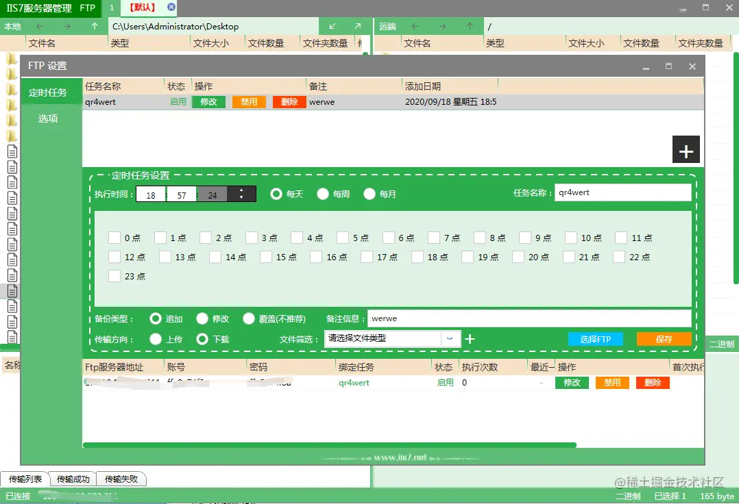 2.添加FTP的IP端口,账户,密码。然后连接FTP. 3.进行定时上传下载的设置: