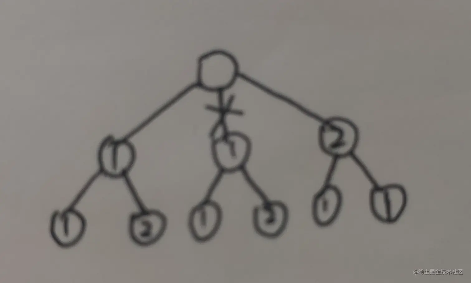 此题关键是选择合法性判断:首先,显而易见,如果路径中的选择已经包含接下来要做的选择,那这个选择肯定不能选,棘手的是不能包含相同的全排列,如果按照普通的全排列写法,就会有重复的全排列.解决办法是:首先对数组进行判断,并用一个布尔数组used存放这个数字是否使用过的信息,如果这个数字被使用过,肯定不能选,关键是还有一种情况,就是上一个数字与这个数字相等,那么上个数字肯定就将所有含有它的全排列都穷举了,所以这个数字肯定就不能再加入到选择列表中了,如下图所示,这就是本题的剪枝.