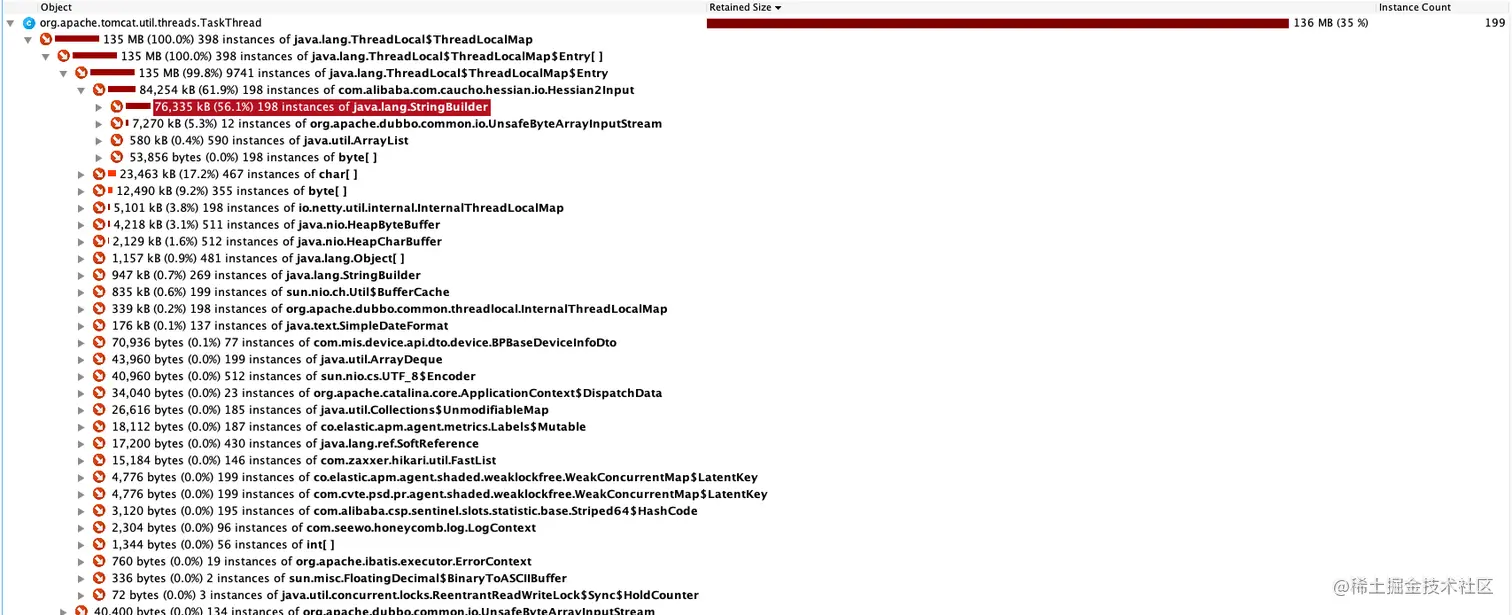 当解析String类型字段时,会使用到Hessian2Input#readString方法,其中的一个逻辑就是将网络流中读取到的字符然后全部添加到Hessian2Input中的StringBuilder中对象中,相当于StringBuilder作为接收字符串的缓冲区,所以就导致了会出现两个很大的StringBuilder对象。