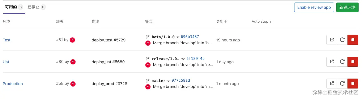 在上面诸多的任务声明中,我们都看到了一个参数 environment,对于单个任务来讲,它可以说是一个环境的辨识,但最重要的是,设置这个参数可以让我们在 GitLab 中很轻松的完成环境管理和回滚操作,相信对于大家,这个也是一个极其重要的步骤,也没人能保证,我们的每一步发布策略都不会出错