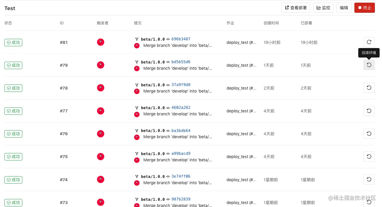 点击回滚操作,GitLab 就会以你当前选中的 Commit 记录为目标,重新部署环境,十分方便的操作