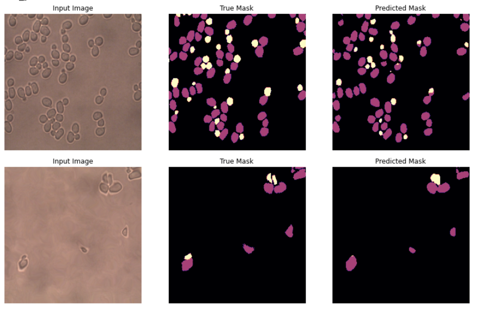 经过30个星期的训练,我们达到了95%的准确性。请注意,选择良好的损失函数很重要。我们首先尝试了交叉熵损失,但是该模型无法区分相貌相似的母细胞和子细胞,并且由于看到的非酵母像素多于酵母像素的类不平衡,因此该模型的性能不佳。
