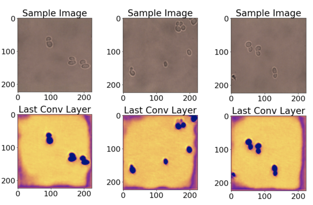 接下来,我们看一下类激活图。这些热图让你了解图像的每个位置对于预测输出类别的重要性。在这里,我们将酵母细胞模型的最后一层可视化,因为类预测标签在很大程度上依赖于它。