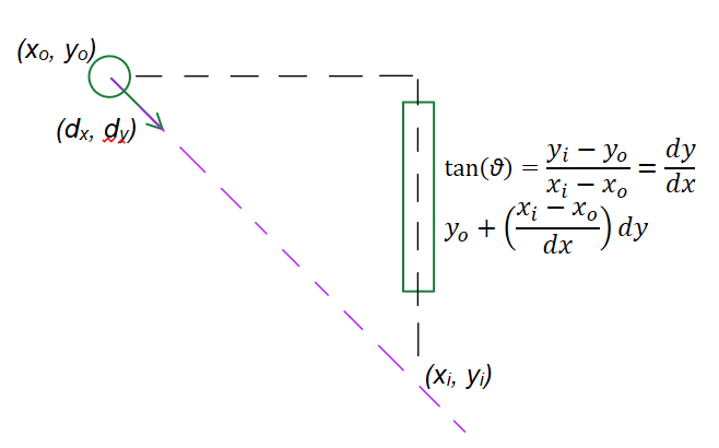 在上面,也许不太明显的计算方法是确定paddle对目标的左或右位置的截距。我们基本上是通过相似三角形来实现的,图片和方程如下所示。我们知道在边界中给定的paddle的x位置的截距。然后我们可以计算出乒乓球将移动多远,并将其添加到当前的y位置。