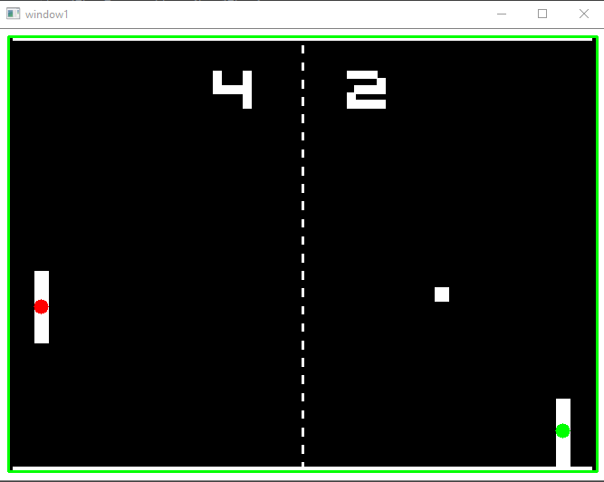 在上面,“vertices”只是定义遮罩区域的坐标列表。一旦在每个区域内有了对象,我就可以得到它们的质心位置或边界框。需要注意的一点是OpenCV将背景作为任何连接的组件列表中的第0个对象,因此在本例中,我总是获取第二大的对象。结果如下——右边绿色质心的球拍是玩家 / 即将成为人工智能控制的球拍。