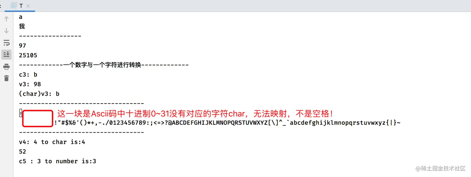 System.out.println("------------一个数字与一个字符进行转换-------------");