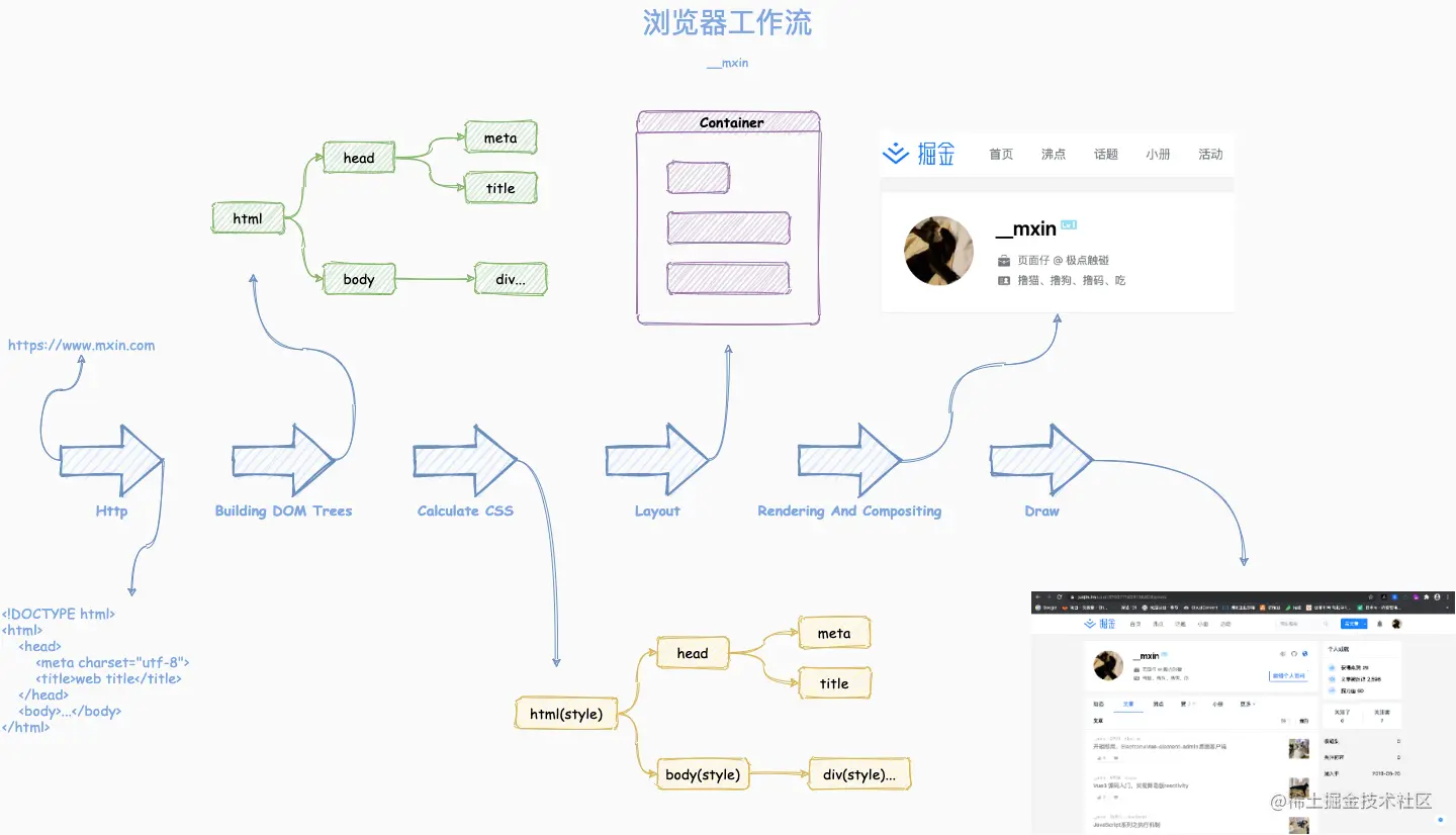 需要注意的是,从 HTTP 请求回来开始,这个过程并非一步做完再做下一步,而是一条流水线,产生了流式的数据,后续的 DOM 树 构建、 CSS 计算、渲染、合成、绘制,都是尽可能地流式处理前一步的产出:即不需要等到上一步骤完全结束,就开始处理上一步的输出,这样我们在浏览网页时,才会看到逐步出现的页面