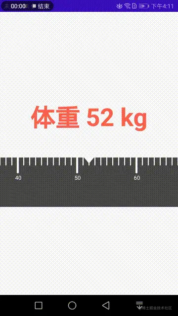 由于指示器需要在中间固定显示,而调整ScrollX会移动画布,即便做矫正处理在快滑时指示器也会左右漂浮不定,所以我在刻度View外面套了一层ViewGroup,指示器在这个ViewGroup中绘制。关于这部分代码非常简单,就不贴了,文章底部会贴出源码地址,有兴趣的可以下载下来阅读。