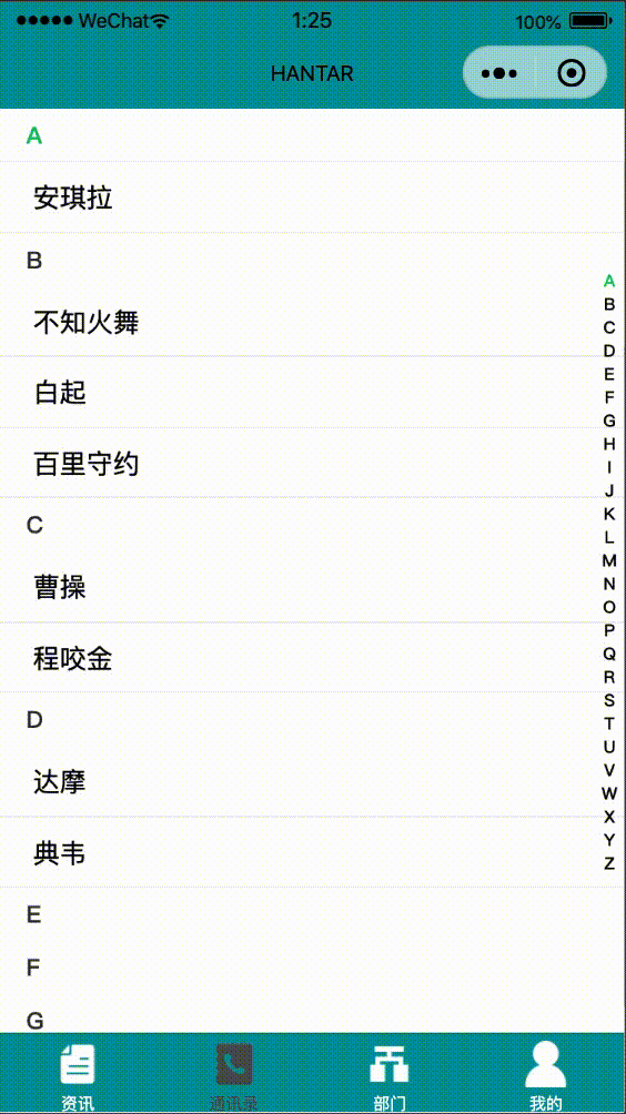 先看下最终效果图,主要是渲染一个A - Z 的 通讯录。同样的,如果你要做的是城市列表,也可以参考一下。