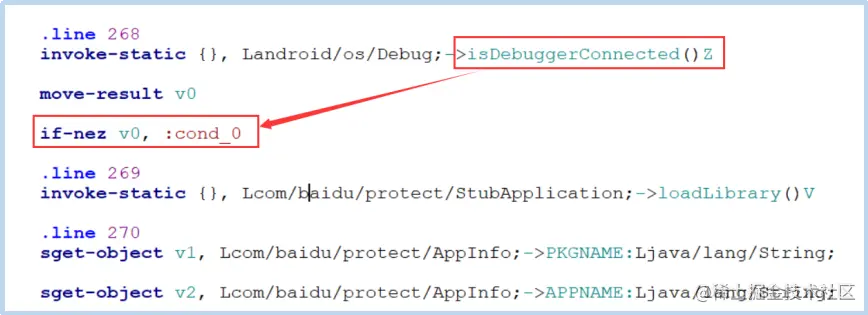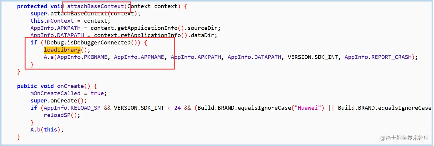 2.找到attachBaseContext方法,里面有一个判断,调用这个Debug. isDebuggerConnected函数来检测程序是否被调试反调,从而执行是否加载so库的逻辑操作,如下图所示。
