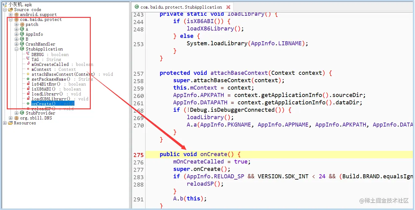 1.将样本拖入jdax-gui中,进行反编译,来到加固程序的onCreate 里,如下图所示。