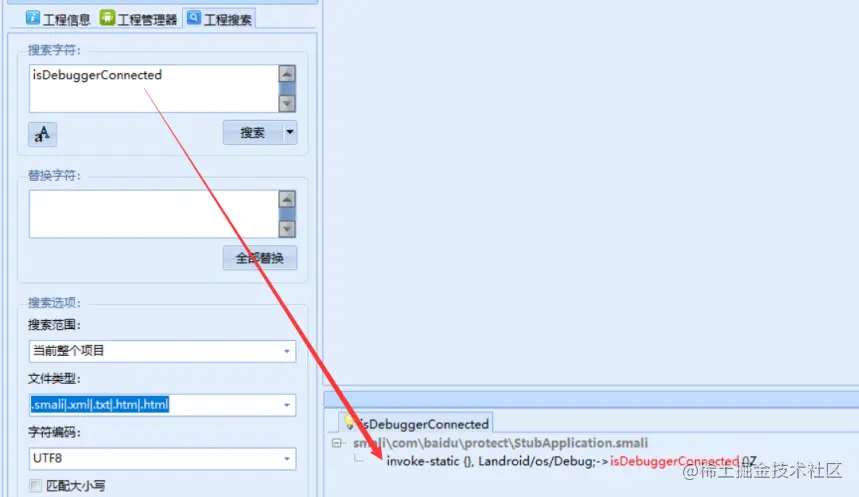 1.使用androidkiller进行反编译,然后搜索isDebuggerConnected,如下图所示。
